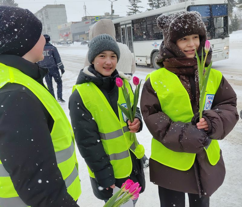 Снегопад не помешал порадовать прекрасный пол: сотрудники останавливали женщин, находящихся за рулем, юидовцы и студенты колледжа поочередно поздравляли автоледи, дарили цветы и памятки, содержащие информацию, направленную на соблюдение ПДД.