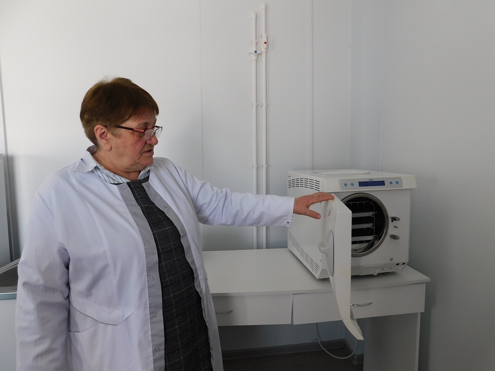 С гордостью показывает современное оснащение пункта. Здесь есть аппарат для стерилизации медикаментов, электрокардиограф, шкафы для хранения препаратов, оборудование для осмотра новорожденных, столики с подогревом, в кабинете акушерки все необходимое для приема.