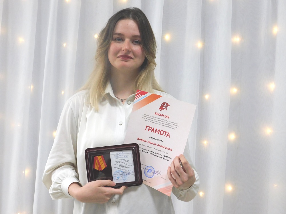 Медалью «Юнармейская доблесть III степени» и грамотой регионального отделения всероссийского военно-патриотического Движения «Юнармия» Ульяна Котова, выпускница Гимназии № 1 Линево, юнармеец, командир отряда «Гвардия». Сейчас Ульяна студентка 3 курса Новосибирского областного колледжа культуры и искусств.
