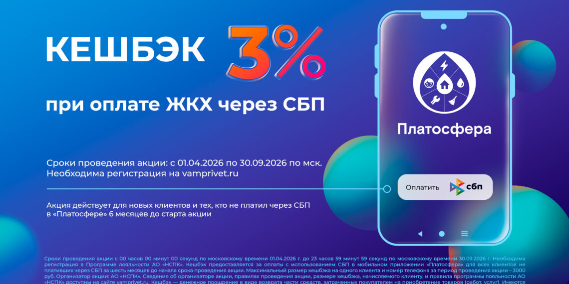Срок проведения акции: с 01.04.2026 до 30.09.2026 по московскому времени. Организатор акции: АО «НСПК». Информация об организаторе и правилах акции на https://vamprivet.ru/promo/ghkh/keshbek-za-pervye-oplaty-zhku-cherez-sbp-v-platosfere-1/. Максимальный размер кешбэка на одного клиента и номер телефона за период проведения акции – 3000 руб. Кешбэк — частичный возврат денежных средств. Имеются ограничения.