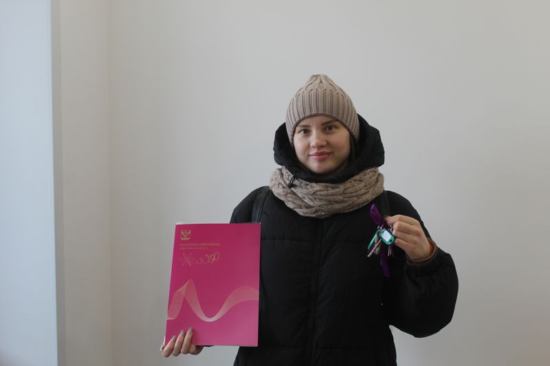 Анастасия Ковалева из села Улыбино — одна из новоселов. Девушке уже исполнилось 25 лет, она успешно работает — ездит на вахту. Недавно приехала в отпуск — и тут такая радостная новость. Квартира ей очень понравилась, а особенно большая уже застекленная лоджия. Устраивает так же этаж — третий.