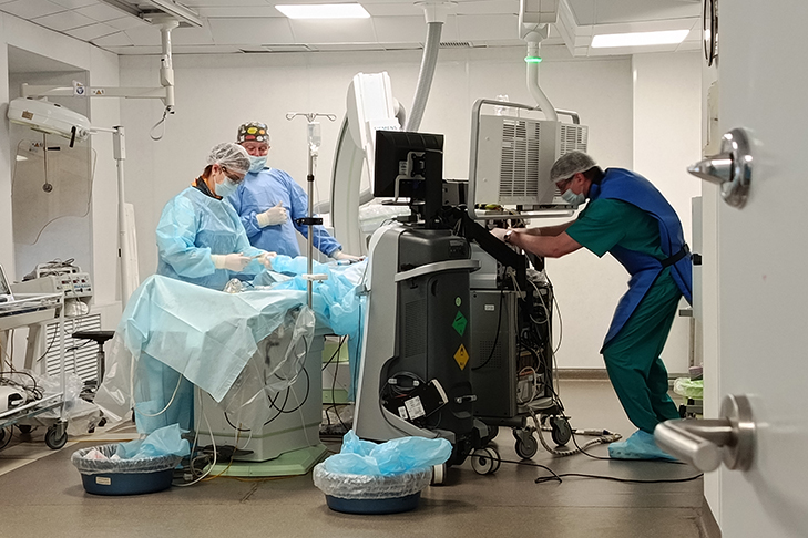 Коронарографию, ангиопластику со стентированием выполняют в рентген хирургическом отделении Новосибирского областного клинического кардиологического диспансера, ежедневно в среднем через операционную проходит 10 пациентов. В конце 2024 года в областном кардиодиспансере по нацпроекту «Здравоохранение» открыли операционную, в которой занимаются хирургическим лечением нарушения ритма сердца. В год здесь проводится порядка тысячи операций.