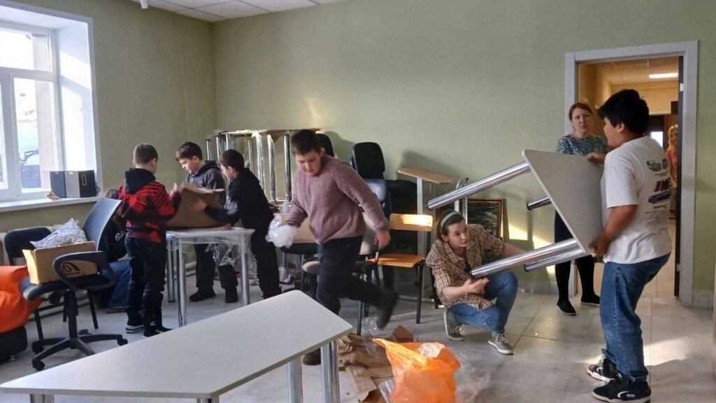 Юные читатели активно участвуют в обустройстве библиотеки. Они помогают распаковывать книги и мебель, знакомятся с библиотекарями и ждут интересных мероприятий.