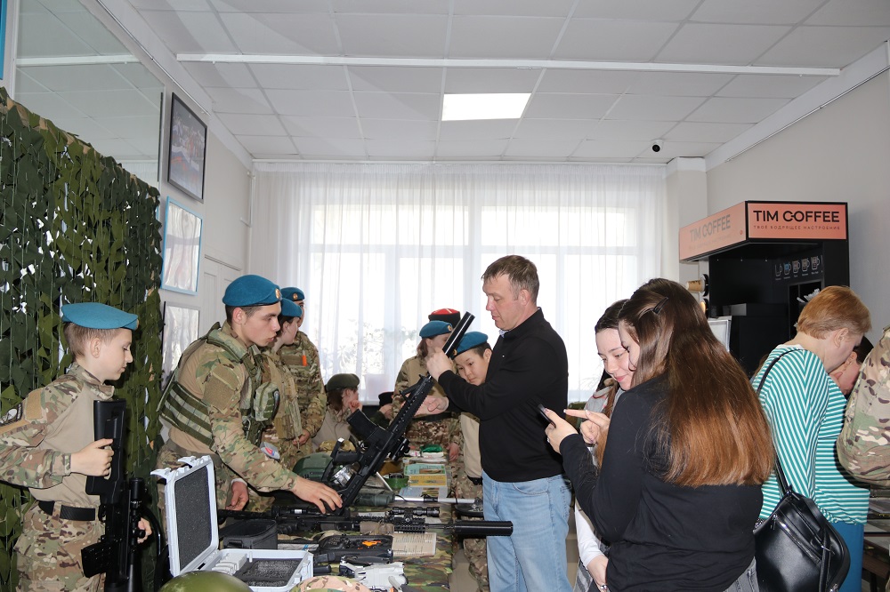 В фойе Дома культуры военно-патриотические объединения представили выставку военного снаряжения и оружия.