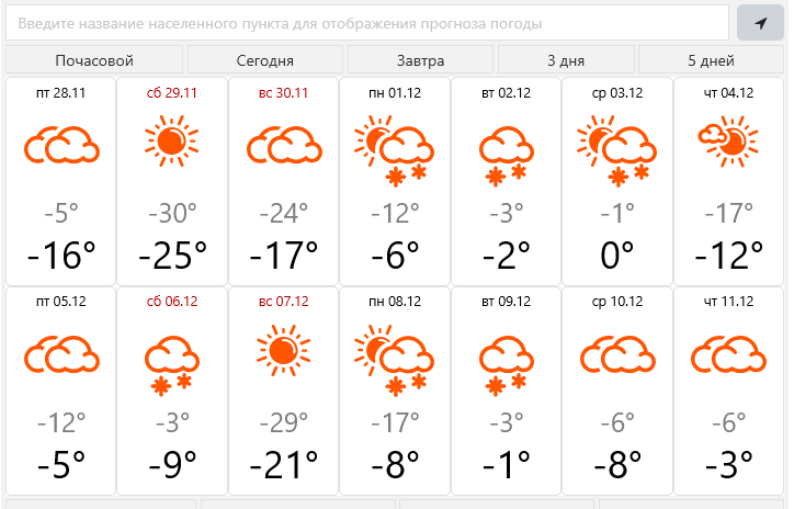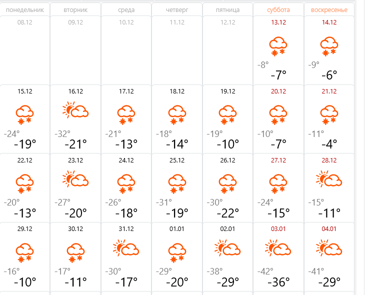 Во второй декаде усиление морозов прогнозируют 15 и 16 декабря. Ночами столбики термометров могут опуститься до -32 градусов. В остальные дни дневные температуры ожидаются от -6 до -14 градусов.