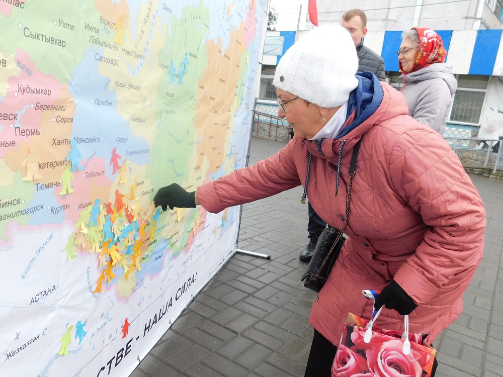 Волонтеры раздавали жителям ленточки триколора и цветных бумажных человечков. Их можно было прикрепить на любое место на карте России.