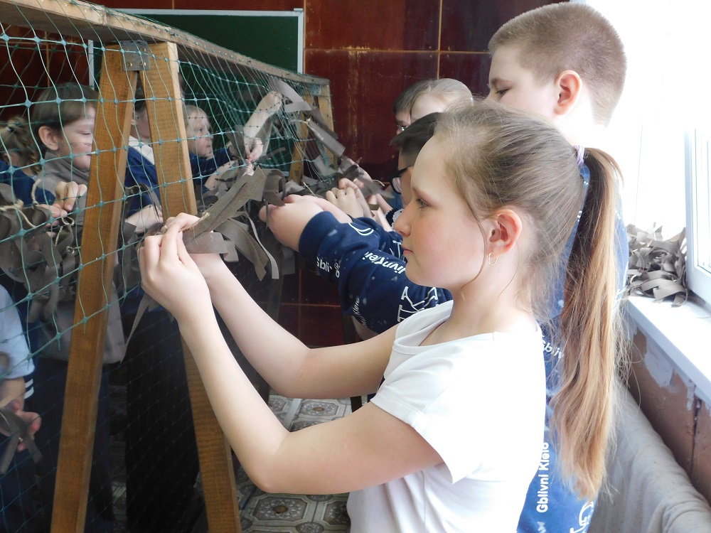 Помогают плести сети родители, бабушки. Каждый день, как на работу, женщины приходят в школу, пока дети на уроках, разрезают ткань на ленточки, чтобы ребятишки плели паучки и в дальнейшем вплетали их в сеть.