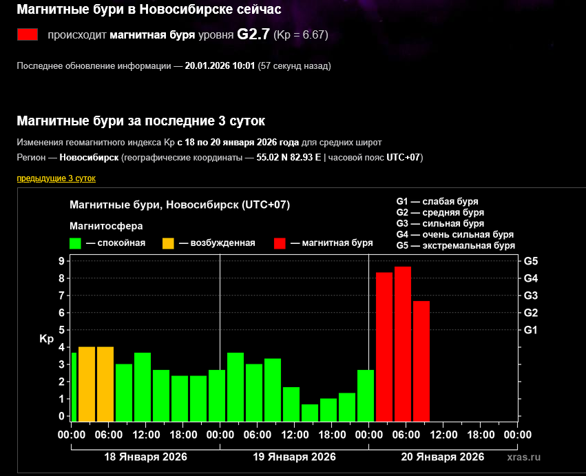 К 4 утра по новосибирскому времени магнитная буря усилилась до G4.7.