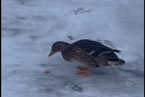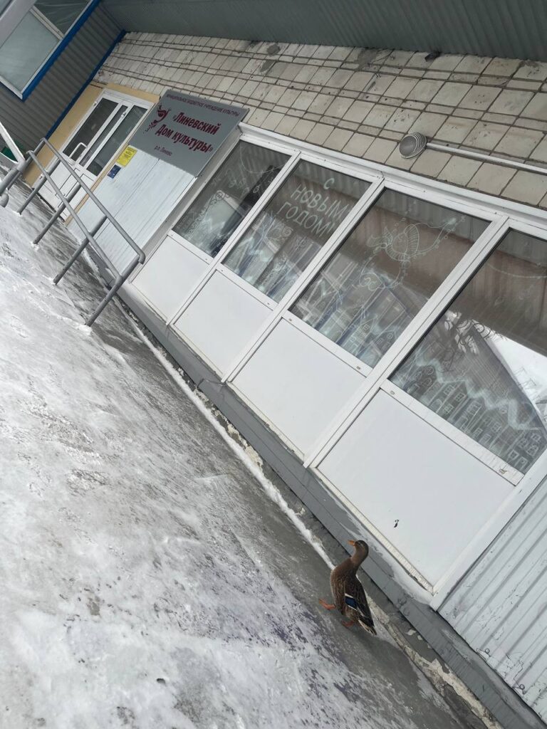 Перед наступлением затяжных морозов у дверей Дома культуры рабочего поселка Линево появилась крошечная гостья — замёрзшая и растерянная уточка.