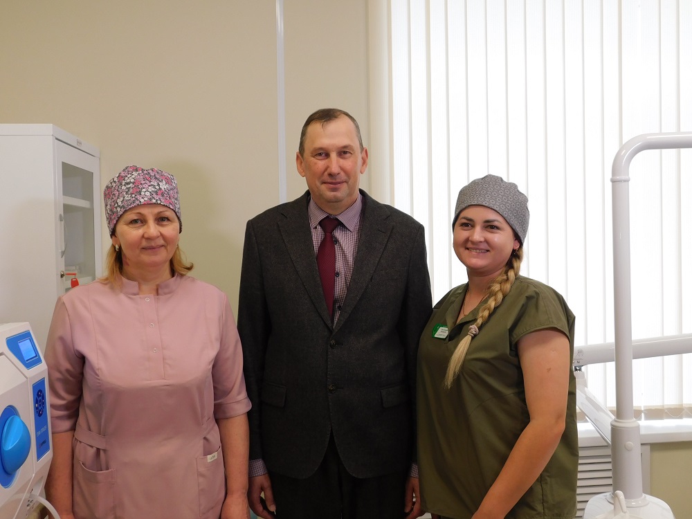 Врач-стоматолог-терапевт Татьяна Тарасцова, главный врач ИЦРБ Владимир Новиков и медицинская сестра Юлия Гладышева