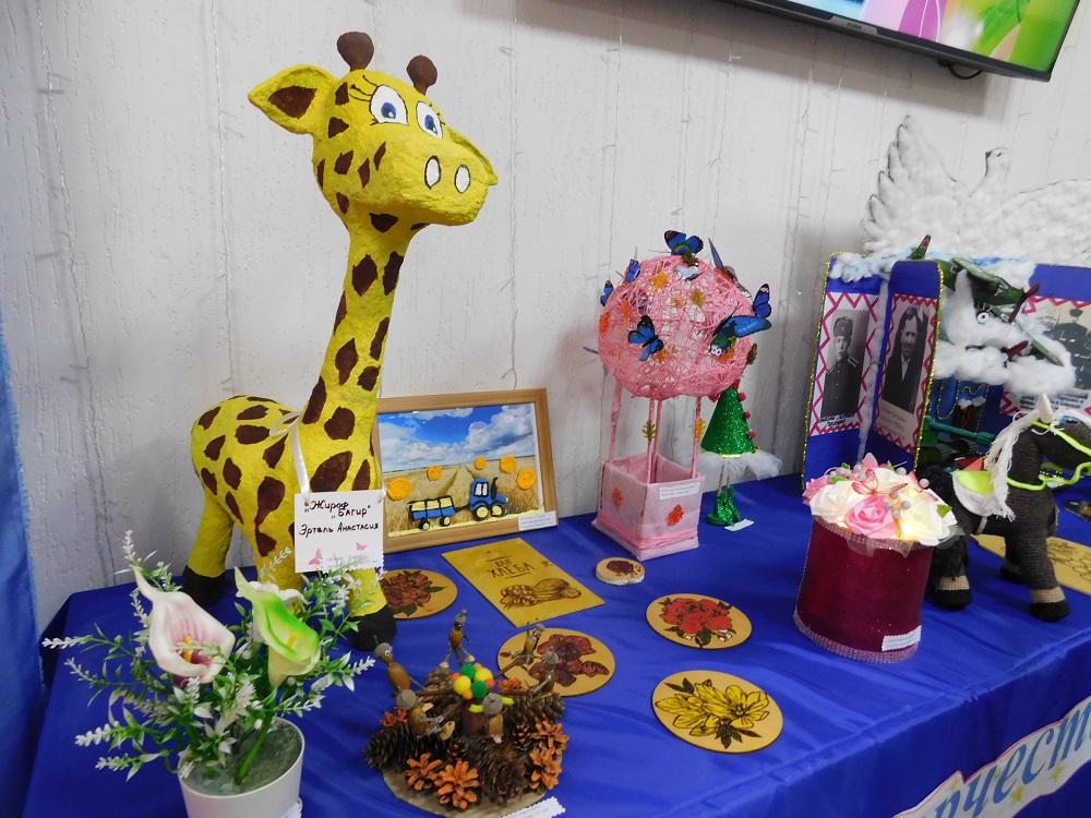 В фойе Дома культуры расположилась выставка творческих работ. Здесь поделки из разных материалов, вязаные игрушки, рисунки.