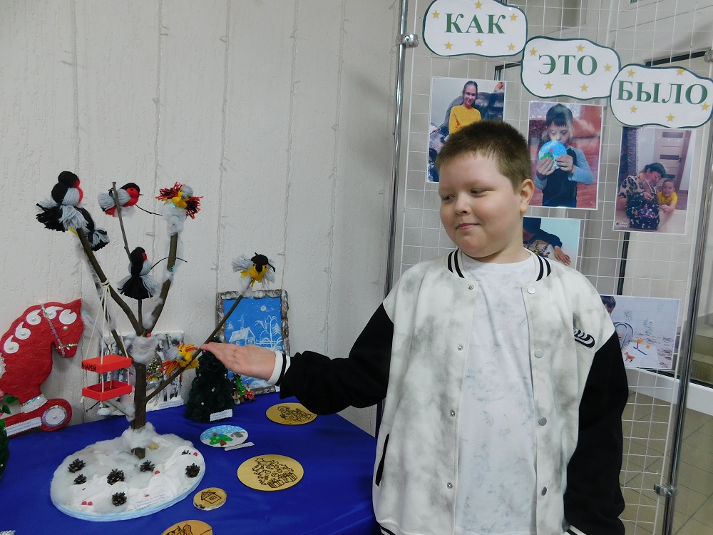 Андрей Белозеров смастерил целую композицию: снегири из пряжи сидят на дереве. Признается, что помогала мама. Любит природу, поэтому его работы всегда на такие темы: водопад или домик в лесу.